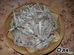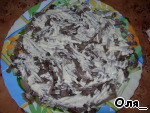 Промазывая майонезом, выкладываем на блюдо слой огурчиков, затем слой языка...