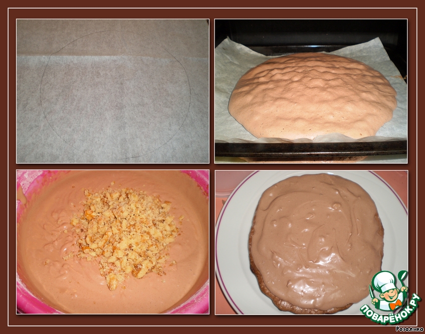 Нарисовать на пергаменте 4 круга диаметром 20 см и выложить белки внутрь кругов. Разровнять сверху. Запекать в течение 1 часа, затем выключить духовку и оставить на 1 час. Достать из духовки, охладить и снять с пергамента.
