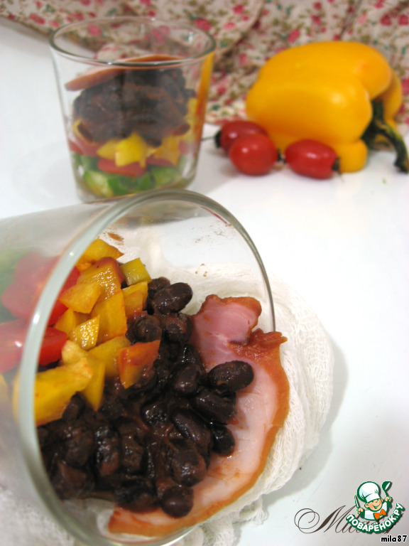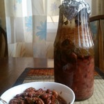 Не забудьте накануне вечером замочить фасоль в слегка подсоленной воде и освободить тару - водку следует выпить! Всю! До дна! (в моем случае - сок, хи-хи) А на следующий день встаем в отличном настроении, бутылочку моем, зелень и чеснок рубим, фасоль промываем и отправляем фасоль, зелень, чеснок, соль, перец черный и зеленый острый (будет остро, не любите - не добавляйте), пюре из томатов (в рецепте без них, но я люблю фасоль в томате) и оливковое масло в бутылку. Доливаем водой так, чтобы она только покрыла фасоль.