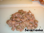 Курицу режем кубиками, солим, перчим, добавляем 1 ст.л. измельченного тимьяна и оставляем на 10 мин.