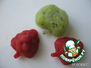 Доставать из морозилки и выкладывать на порционный десерт непосредственно перед подачей на стол. А яблочки у меня из киви! ;-)