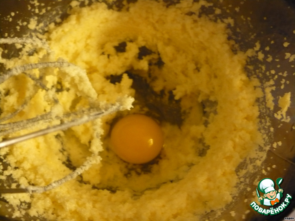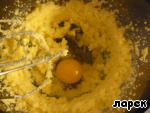 Размягченный маргарин, сахар и яйцо взбить миксером в однородную массу. -