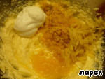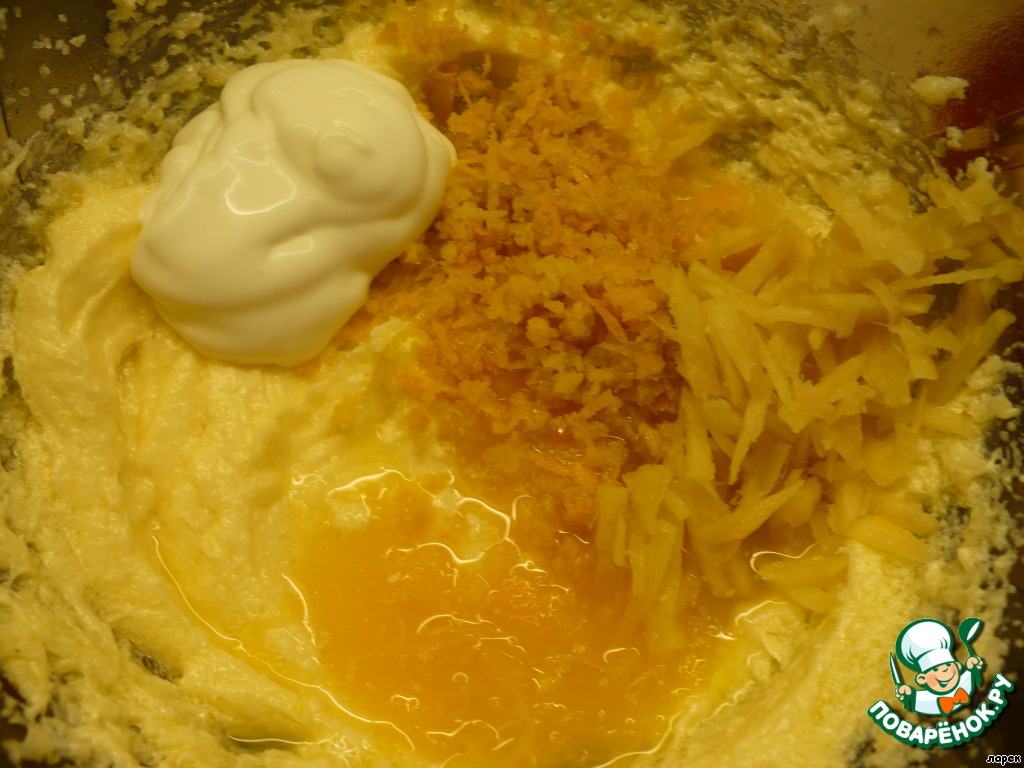 Теперь добавляем оставшиеся 50 мл сока, всю цедру, столовую ложку нарезанного имбиря и столовую ложку сметаны. Еще раз перемешиваем - теперь ложкой.