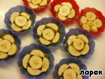 Нарезаем на пятаки бананы и укладываем на слегка остывшую карамель