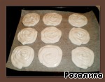 На пекарской бумаге начертить круги. Чайной ложкой или шприцем выложить на застеленный бумагой противень круглые лепешки.