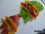Для начала заглянем в холодильник и проверим его содержимое. Вполне могли заваляться маринованные или свежие огурчики, колбаска, ветчина, различные овощи и просто красный лук (кто любит, конечно). У меня выбор был сегодня победнее - сладкие перцы, пластинка бекона и салат. Ничего, пойдет. На свой вкус составляем композицию. Можно для оживления вкуса капнуть горчички или даже майонеза (мама дорогая, что я говорю!!!:-D) У меня вот как-то так получилось. Неказисто, ну ничего, с пивом потянет