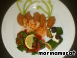 Креветки с баклажановой икрой и салатом из помидоров и мяты