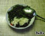 К размолотой зелени добавляем раздавленный чеснок и смешиваем все с алычовым пюре. Добавляем немного отлитого сока, чтобы не было очень густо, солим.