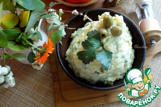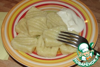 Разомнем картофель вилкой, добавим сметану + желтки + соль (немного, сыр тоже соленый, надо это учитывать). Хорошо перемешаем.