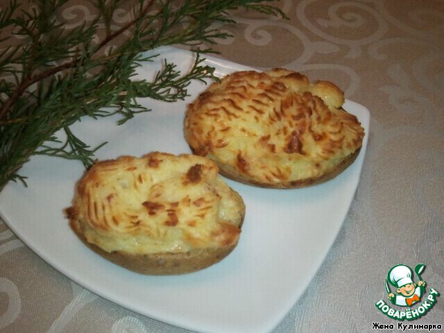 Теперь снова заполняем половинки картофельным тестом. Немного можно оставить и нанести сверху с помощью кондитерского шприца рисунок. Или выкладывайте с горкой и наносите узор с помощью вилки. Ставим в разогретую до 250 гр духовку. Запекаем до золотистого цвета (чтобы вид был более красивый, можно сверху смазать яйцом).