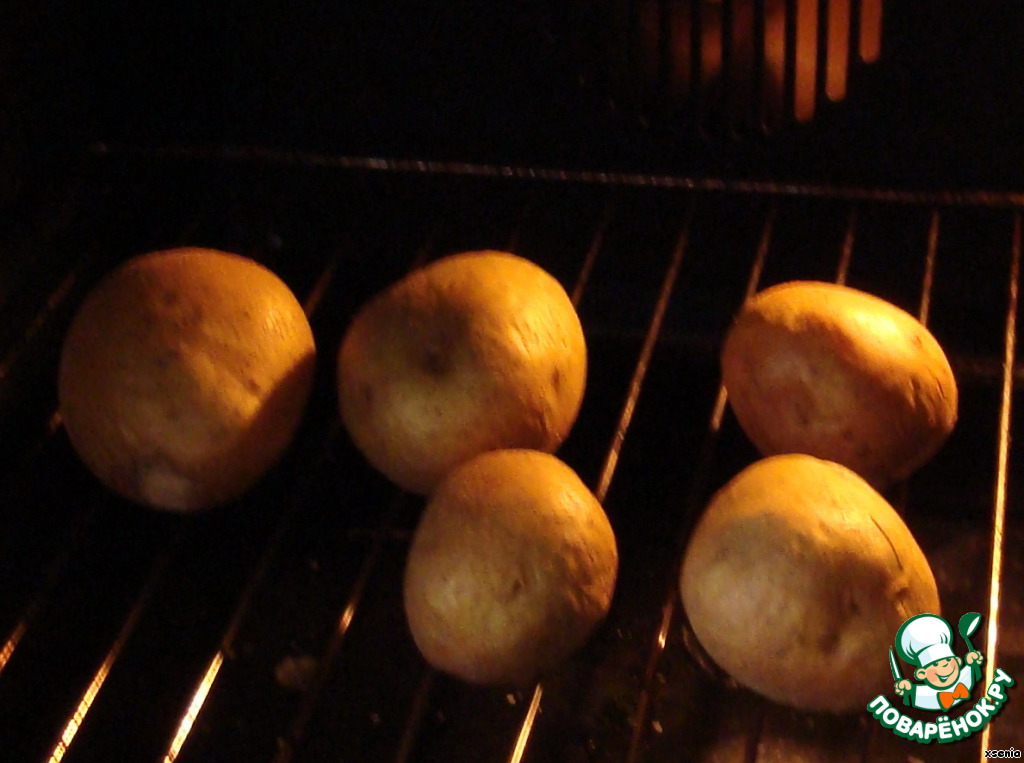 Картофель хорошо промыть и запечь в духовке до готовности (готовность проверяем деревянной шпажкой или зубочисткой). -