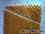 Потом вафельки размокают от сгущенки и закрываем ими торт, обливаем остатками глазури.