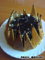 Торт облить шоколадной глазурью. И вокруг поставить вафельки.