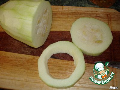 Кабачок очистить, порезать кольцами (1-1,5 см), вынуть сердцевину. Посолить.