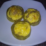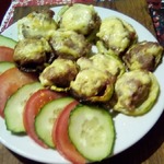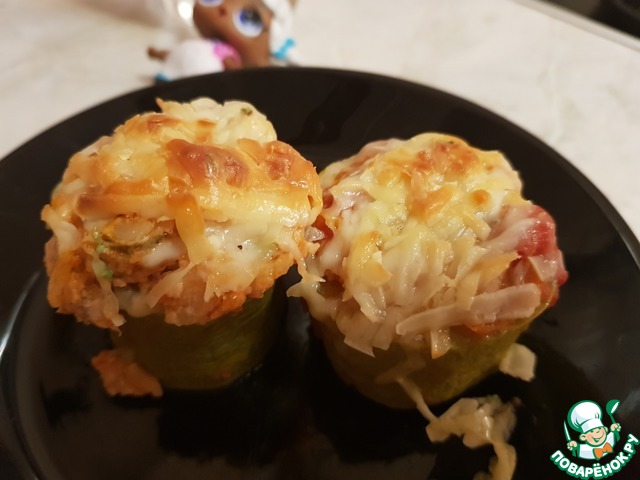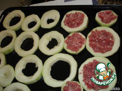 Выложить на противень, смазанный растительным маслом, кружочки из кабачка. Наполнить середину фаршем.