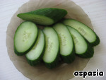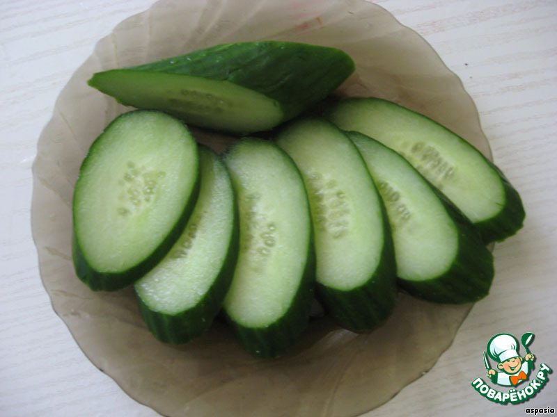 Огурец нарезать наискосок ломтиками 5-7 мм.