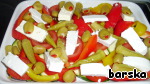 Сверху выложить: оливки (с паприкой внутри), брынзу разную (у меня была Фета с оливками и турецкая брынза для Buerек), пеперони, какие есть (в этом варианте у меня были Okra из турецкого магазина)