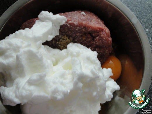 Фарш смешать с желтками, солью, специями и луком. Добавить белки и осторожно перемешать. -