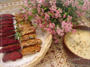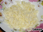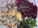 Первым делом из крупы варим кашу. А затем готовим два типа котлет - свекольные (розовые) и с копченым мясом (беленькие). Для розовых котлеток готовим фарш следующего состава. Лук слегка обжариваем, отварную свеклу чистим и трем на мелкой терке. Ее нужно отжать, чтобы избавиться от лишнего сока. Добавляем ячменную кашу, зелень, яйцо, крахмал, соль, перец по вкусу. Все перемешиваем.