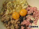 Для фарша соединяем поджаренный лук, ячменную кашу, картофельное пюре, измельченное копченое мясо, потертый сыр, травы, яйца, соль, перец. Фарш перемешиваем и жарим котлетки, предварительно обваляв в панировочных сухарях.