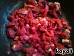 добавляем мясо, помидоры и виноградную кислоту (сок неспелого винограда, можно заменить лимонным соком) и соль по вкусу. По желанию можно добавить томатной пасты, я не добавляла. Советую пробовать на кислинку после того, как посолили. Перeмешать и томить под крышкой на медленном огне еще 30-40 минут.