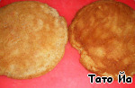 Пропитываем первый корж, сверху выкладываем половину крема. -