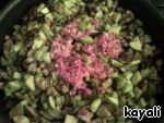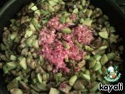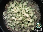 Лук обжарить (в идеале - на бараньем жиру, но вполне можно заменить растительным маслом) до золотистого цвета (я обжариваю на сковороде, а потом перекладываю в форму для духовки). Добавить кабачки, перемешать и поставить в разогретую духовку (200-220*) минут на 5-7.