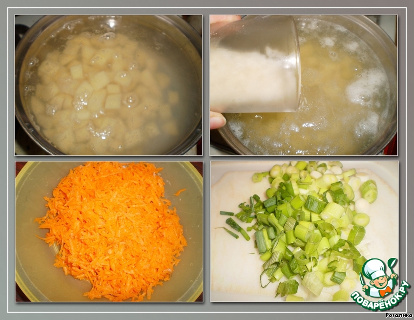 В кастрюлю нальем воды и поставим на огонь, пока вода греется, почистим картофель и морковь. Картофель порежем на кубики.