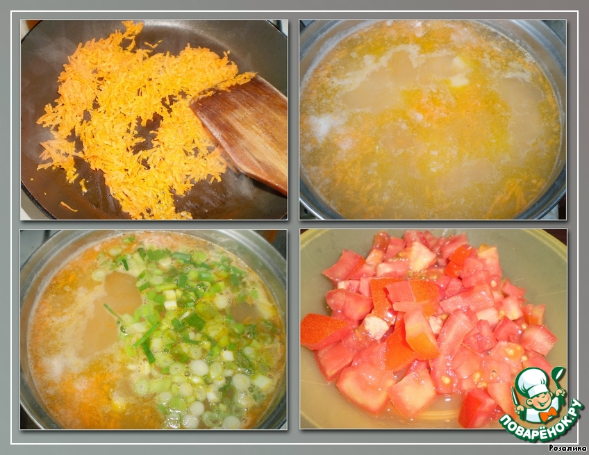 Поставим сковороду на огонь, нальем туда масло. Морковь тушим 5-7 минут. Потом добавляем зеленый лук потушим 1-2 минуты. Помидор ошпарить кипятком, снять шкурку, нарезать маленькими кубиками.