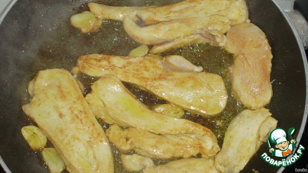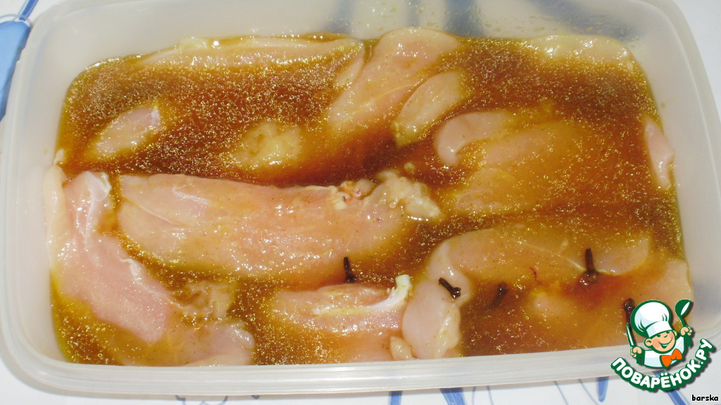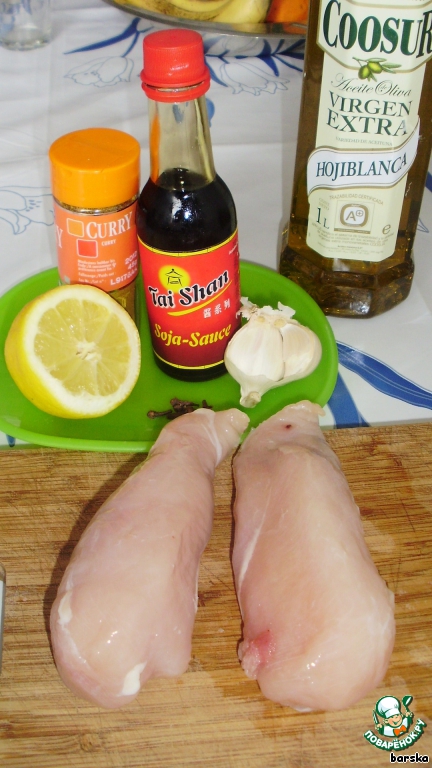 Сделать соус для маринада: оливковое масло, соевый соус, сок 0,5 лимона + мёд (кому нравится), добавить гвоздику и карри - по вкусу. Мариновать 10-15 минут -