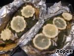 Через полчаса рыбу достать, фольгу развернуть, положить кружки лимона и снова в духовку на 10 минут