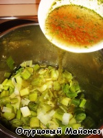 Лук-порей очищаем от верхней зелёной части, промываем и режем на кусочки 2-3 см. Складываем в кастрюлю, добавляем 3 столовые ложки оливкового масла и тушим на среднем огне до готовности лука (около 15 минут).