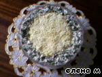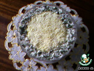 Белок яйца натираем на мелкой тёрке и смешиваем с очень мелко нарезанной зеленью укропа. Выкладываем по краю. -