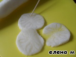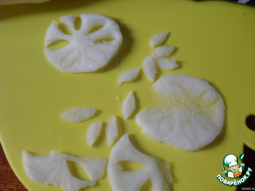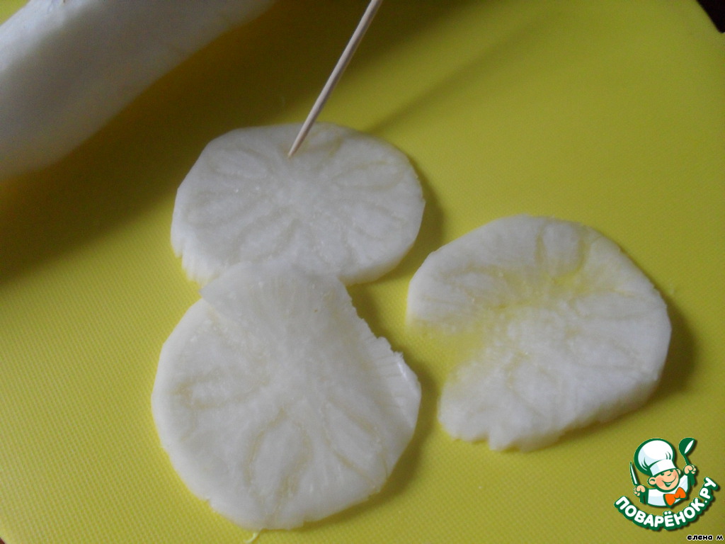 Из тонко нарезанных кружков (можно и лент) дайкона делаем лепестки: деревянной зубочисткой рисуем лепестки -