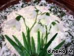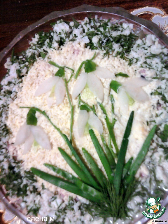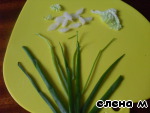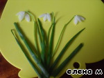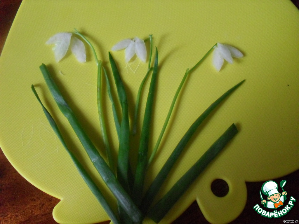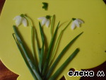 Листочки "подснежников" делаем из зеленого лука, стебельки - из тонких стеблей укропа или петрушки, венчик цветка - из маленького кусочка пекинской капусты.