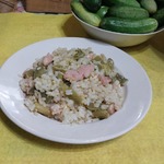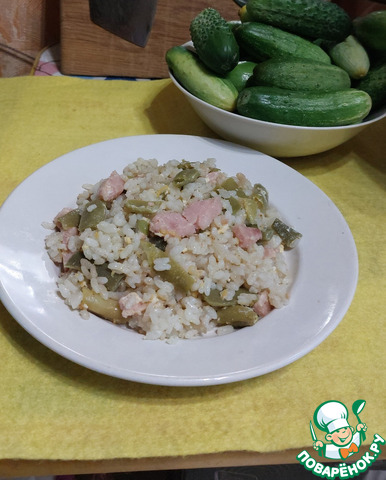 Жареный рис с колбасой и зеленой фасолью