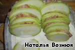 • -Кабачки нарезать колечками, как можно тоньше, под углом, чтоб получились язычки