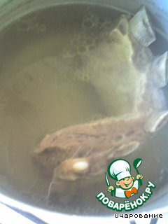 Приготовить мясной бульон. Я варю целым куском, а потом вынимаю и режу на кусочки.