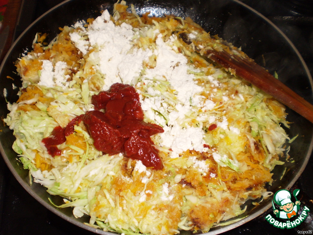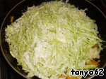Затем тертые на терке серединки кабачков и нашинкованную тонко капусту. Обжарить.