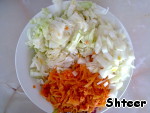 Мелко нашинковать капусту, нарезать лук, перетереть морковь и посолить.