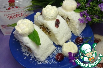 Творог протереть через сито или пропустить через мясорубку (для воздушности). Если творог сухой - добавить немного йогурта или сметаны. Соединить с печеньем, желтками и растопленным сливочным маслом. Перемешать, чтобы масса не содержала комочков.