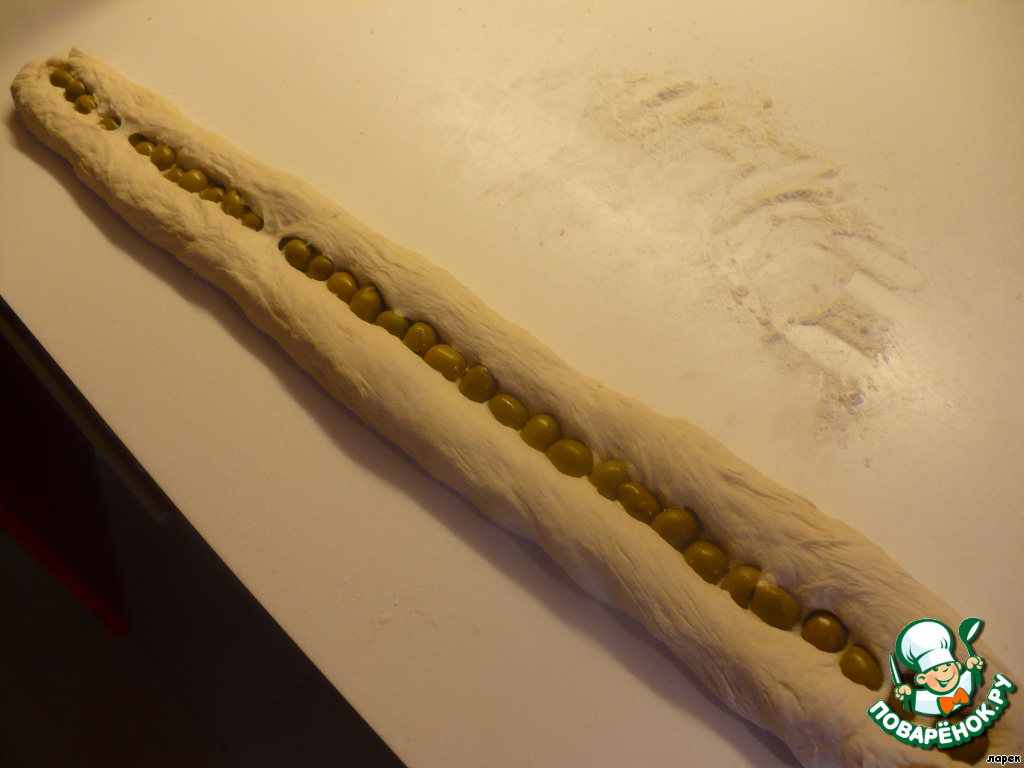 После подъема выложить тесто на стол, слегка обмять, сформировать колбаску и глубоко утопить оливки по всей длине. Я их зачем-то разрезала на половинки. Кто знает, зачем? Вот и я не знаю. -