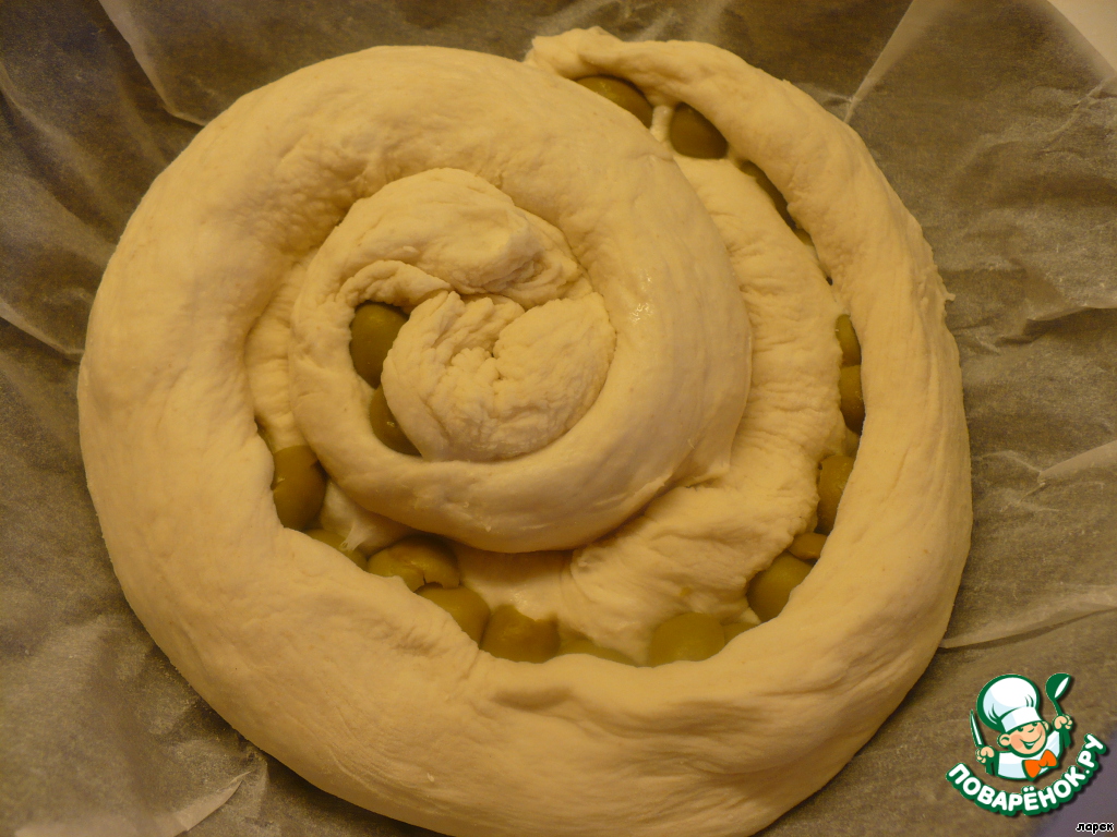 Можно защипнуть тесто вокруг оливок, можно так оставить. У меня во время переноса теста в форму некоторая часть оливок завернулась в тесто - так и оставила.