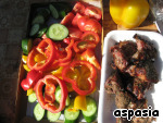 Настоящее мясо у горной реки, с дымком, специями и овощами - что может быть лучше!! А польза здоровью, друзьям, настроению!!! Самое главное, что рецепт придумала моя сестра, а в походы мы едем обычно "дамской" компанией, потому и делаем шашлык сами!! Попробуйте, не ошибетесь и забудете все эти маринады - вино, майонез, кефир, пиво, тем более бр-р-р-р уксус! Испробовано на протяжении 2 лет!