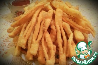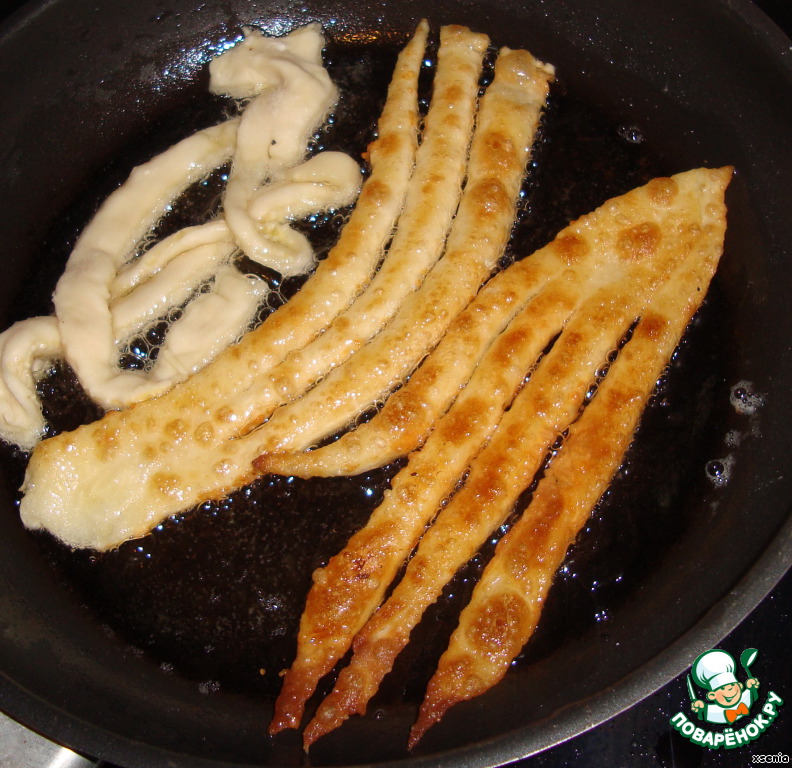 В хорошо нагретое растительное масло выкладываем хворост и обжариваем на среднем огне с двух сторон