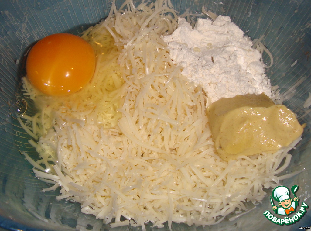 Пока тесто остывает, смешиваем тертый сыр + мука + горчица + 1 яйцо