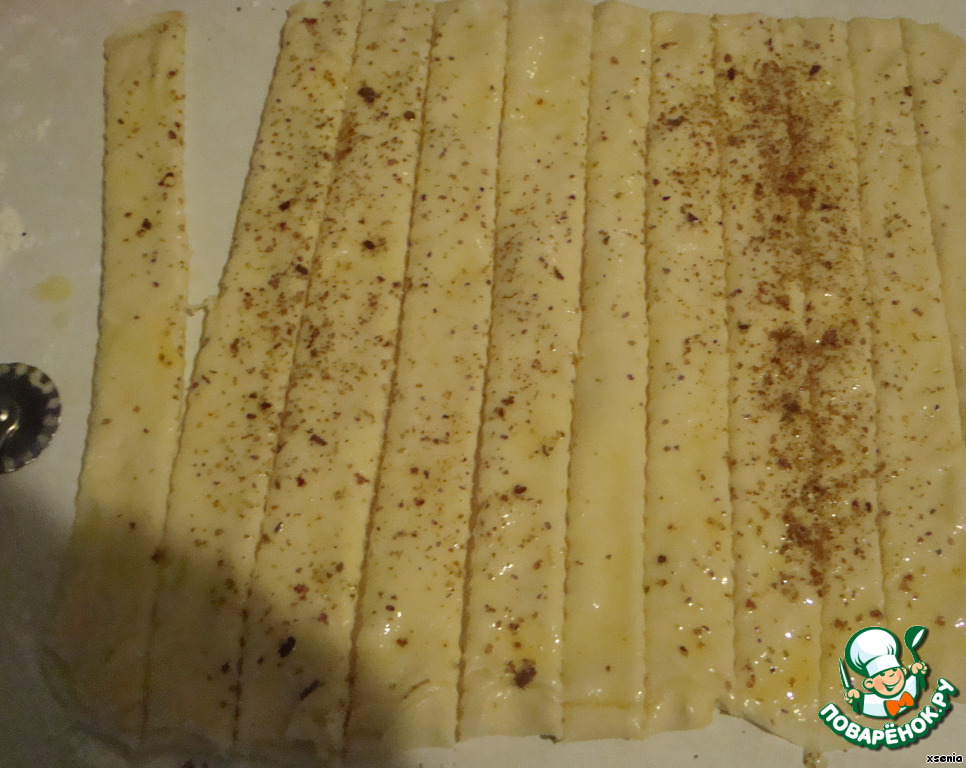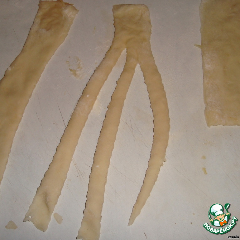 Еще мы будем жарить. Процесс полностью повторяем со второй половиной теста. Но режем на полоски пошире.. и потом эти полоски еще на несколько полосок, не дорезая до конца. Вобщем, форма хвороста. -