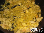 Добавить и немного поджарить измельчённый в крошку хлеб
