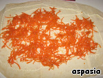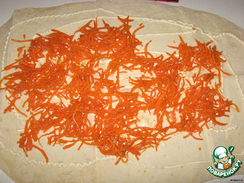 Первый лист лаваша расстелить на столе, намазать майонезом, выложить морковь по-корейски.