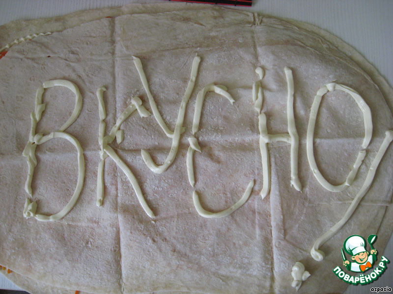 Выложить сверху второй лист лаваша, намазать майонезом.